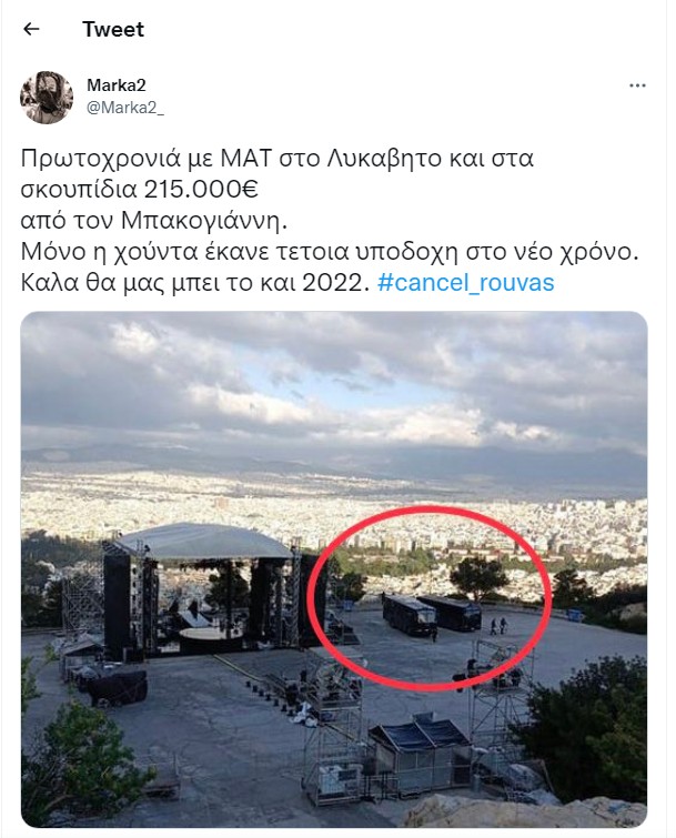 Σουρεαλιστικές σκηνές εκτυλίχθηκαν στον Λυκαβηττό παραμονή Πρωτοχρονιάς όπου ο Σάκης Ρουβάς με 17μελή ορχήστρα και τον Κώστα Μπακογιάννη με τα παιδιά του μοναδικούς θεατές, μαζί με δύο κλούβες ΜΑΤ, «γιόρτασαν» την έλευση του 2022.