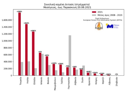 Εικόνα 2: Συνολική καμένη έκταση με βάση τα στοιχεία του EFFIS στις χώρες της Μεσογείου έως και το μεσημέρι της Παρασκευής 20 Αυγούστου 2021.