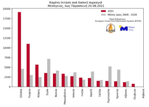 Χρησιμοποιώντας τα δεδομένα αυτά, προκύπτει ότι η μέση καμένη έκταση ανά δασική πυρκαγιά στην Ελλάδα ανέρχεται σε περίπου 19.000 στρέμματα για το 2021 (έως και 20.08.2021), γεγονός που κατατάσσει τη χώρα μας πρώτη στη Μεσόγειο, με πολύ σημαντική διαφορά ακόμα και από τη δεύτερη Τουρκία.