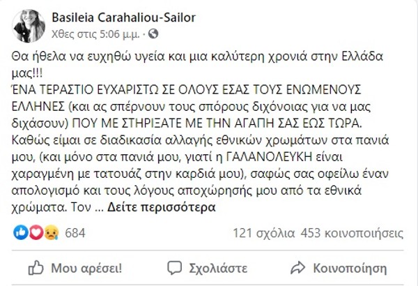 Η 25χρονη ιστιοπλόος, Βασιλεία Καραχάλιου ανακοίνωσε, με ανάρτησή της στο Facebook, ότι έχει εκκινήσει τις διαδικασίες για να αλλάξει "εθνικά χρώματα" στα πανιά της: