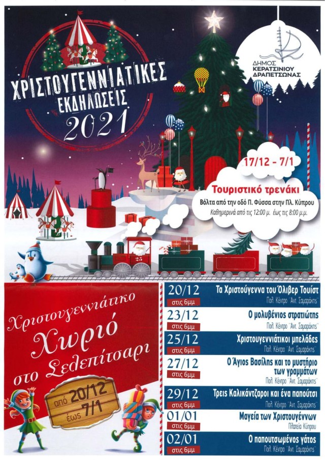 Ο Δήμος Κερατσινίου – Δραπετσώνας σε συνεργασία με τον Εμπορικό Σύλλογο Κερατσινίου – Δραπετσώνας για ακόμα μία χρονιά διοργανώνουν βόλτες στην πόλη μας συνδέοντας τα εμπορικά σημεία με το μαγικό τρενάκι των Χριστουγέννων. Το τρενάκι θα λειτουργεί καθημερινά ώρες 12.00 – 20.00 έως τις 7 Ιανουαρίου  με συχνότητα δρομολογίων ανά μία ώρα.