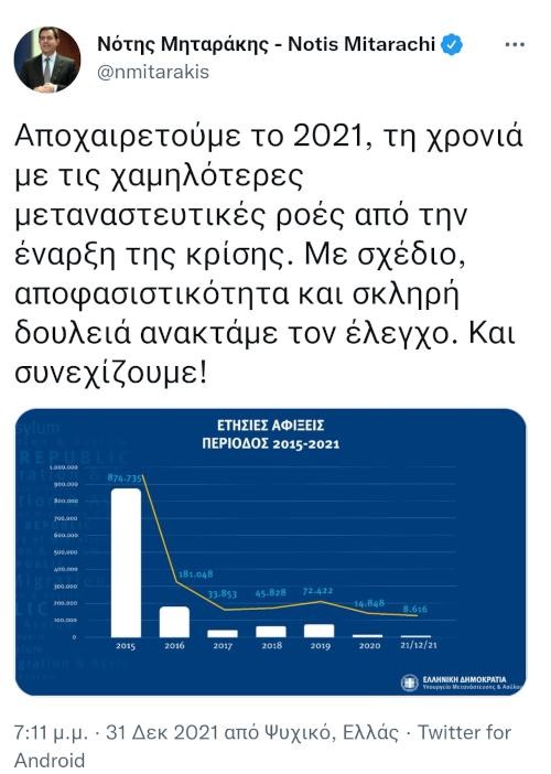 Με το μήνυμά του την παραμονή της Πρωτοχρονιάς για να αποχαιρετήσει το 2021, ο υπουργός Μετανάστευσης και Ασύλου Νότης Μηταράκης επιβεβαίωσε κι αυτός την τεράστια απόκλιση μεταξύ όσων διέσωσε το Λιμενικό στο Αιγαίο τη χρονιά που μας πέρασε και την προηγούμενη χρονιά και των αφίξεων που καταγράφηκαν στην Ελλάδα.